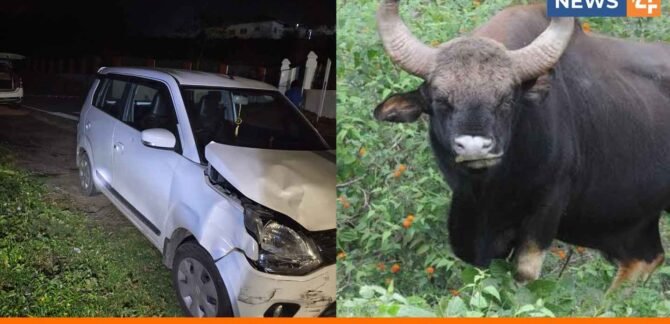 മൂന്നാർ മാട്ടുപ്പെട്ടിയിൽ റോഡിന് കുറുകെ ചാടിയ കാട്ടുപോത്തിനെ ഇടിച്ച് കാർ തകർന്നു