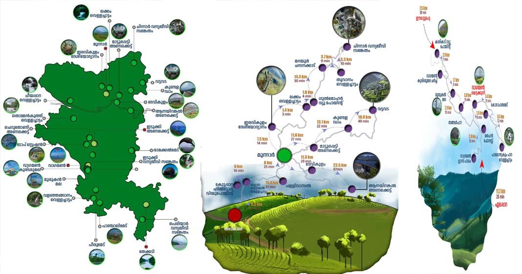 തേയിലത്തോട്ടങ്ങളുടെ പച്ചപ്പിൽ പൊതിഞ്ഞ മൂന്നാറിൽ നിന്ന് മൂടൽമഞ്ഞിൽ മറഞ്ഞ വാഗമണിലേക്കും, വന്യജീവികൾ നിറഞ്ഞ തേക്കടിയിലേക്കും, കാറ്റിന്റെ നൃത്തം നടത്തുന്ന രാമക്കൽമേട്ടിലേക്കും നീളുന്ന ഈ യാത്ര മനസ്സിനെ മായ്ക്കും.