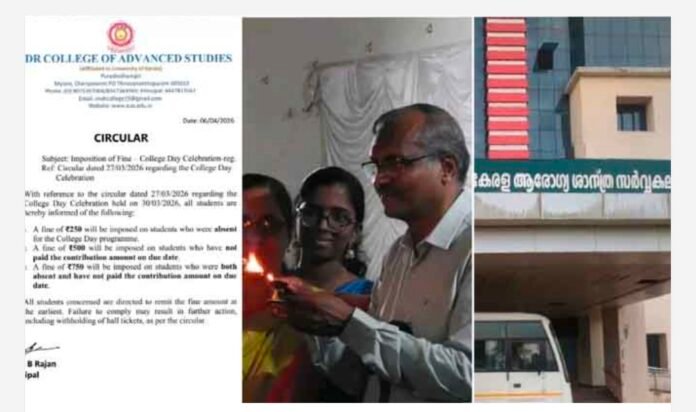 കോളജ് ഡേയ്ക്ക് വന്നില്ലെങ്കിൽ ഹാൾടിക്കറ്റില്ല; ഐ.എം.ഡി.ആർ കോളജിന്റെ പിഴ വിവാദത്തിൽ വൈസ് ചാൻസലർ വിശദീകരണം തേടി തിരുവനന്തപുരം: കോളജ് ഡേയിൽ പങ്കെടുക്കാത്ത വിദ്യാർത്ഥികൾക്ക് പിഴ ചുമത്തുന്ന സർക്കുലർ പുറപ്പെടുവിച്ചതിനെ തുടർന്ന് ഐ.എം.ഡി.ആർ കോളജ്ക്കെതിരെ നടപടി സാധ്യത ഉയർന്നു. സംഭവത്തിൽ കേരള ആരോഗ്യ സർവകലാശാല വൈസ് ചാൻസലർ കോളജ് അധികൃതരോട് വിശദീകരണം തേടി. കോളജ് ഡേയിൽ പങ്കെടുക്കാത്തതോ പരിപാടിക്കായി സംഭാവന നൽകാത്തതോ ആയ വിദ്യാർത്ഥികളിൽ നിന്ന് പിഴ ഈടാക്കുമെന്ന് പ്രിൻസിപ്പൽ ഡോ. ജെ.ബി. രാജൻ പുറത്തിറക്കിയ സർക്കുലറാണ് വിവാദത്തിന് … Continue reading കോളജ് ഡേയ്ക്ക് വന്നില്ലെങ്കിൽ ഹാൾടിക്കറ്റില്ല; ഐ.എം.ഡി.ആർ കോളജിന്റെ പിഴ വിവാദത്തിൽ വൈസ് ചാൻസലർ വിശദീകരണം തേടി
