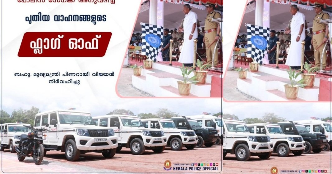 Kerala CM Pinarayi Vijayan flags off 49 new vehicles for the state police, including Bolero jeeps, forensic vans, Gurkha jeeps, buses, and Royal Enfield bikes, enhancing patrol and investigation efficiency.