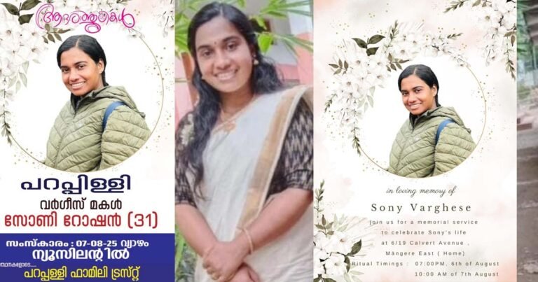 ന്യൂസീലൻഡ്: ന്യൂസീലൻഡ് മലയാളികളെ കണ്ണീരിലാഴ്ത്തി മലയാളി നഴ്സിന്റെ അപ്രതീക്ഷിത വിയോഗം. എറണാകുളം അങ്കമാലി സ്വദേശി സോണി വർഗീസ്(31)ആണ് മരിച്ചത്. ഭർത്താവിനും കൈക്കുഞ്ഞിനും ഒപ്പം പ്രവാസ സ്വപ്നങ്ങളുമായി സോണി ന്യൂസീലൻഡിലേക്ക് എത്തിയിട്ട് രണ്ടുവർഷം ആവുന്നതെ ഉള്ളു. ഒന്നര വർഷം മുമ്പാണ് പ്രസവത്തിന് പിന്നാലെയാണ് ഹൃദയസംബന്ധമായ അസുഖം തിരിച്ചറിഞ്ഞത്. പിന്നീട് അങ്ങോട് ചികിത്സയുടേയും പ്രാർഥനയുടേയും ദിനങ്ങളായിരുന്നു. അസുഖം മൂർച്ഛിച്ചതോടെ ഹൃദയം മാറ്റിവെക്കൽ മാത്രമായിരുന്നു ഏക പോംവഴി. അതിനുവേണ്ടിയുള്ള തയ്യാറെടുപ്പിലായിരുന്നു സോണിയും കുടുംബവും. ന്യൂസീലൻഡ് Calvert Avenue, Māngere Eastൽ ഭർത്താവ് … Continue reading ന്യൂസീലൻഡ് മലയാളികളെ കണ്ണീരിലാഴ്ത്തി മലയാളി നഴ്സിന്റെ അപ്രതീക്ഷിത വിയോഗം; ഒന്നര വയസുള്ള മകനെ തനിച്ചാക്കി സോണി യാത്രയായി… മരിച്ചത് മലയാറ്റൂർ സ്വദേശിനി