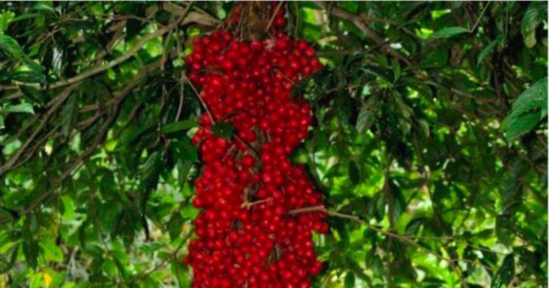 ചുവപ്പ് നിറമുള്ള ഈ പഴം വലുപ്പത്തിൽ വലിയ നെല്ലിക്കയെപ്പോലെയാണ്; മൂന്നു വിത്തുകളാണ് ഓരോ ഫലത്തിലും കാണപ്പെടുന്നത്. മരത്തിന് പരമാവധി 15 അടി വരെ ഉയരമുണ്ടാകും.