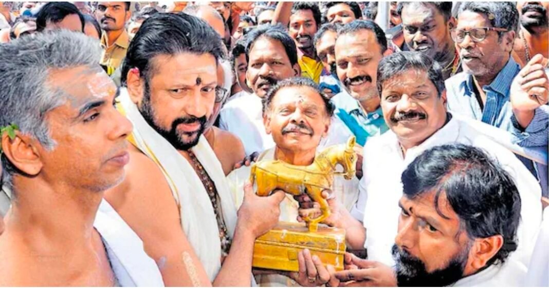 Visual evidence has emerged showing that the handover of the Vajivahanam (horse idol) from the old flagstaff at Sabarimala to the Tantri was carried out during a public ceremony attended by CPM representative K. Raghavan, along with then Devaswom Board president and members. This contradicts Raghavan’s claim that he had no knowledge or role in the decision. The revelation comes amid CPM’s allegations that the transfer was illegal and occurred during a Congress-led Devaswom Board, raising fresh controversy over the ownership and handling of temple assets.