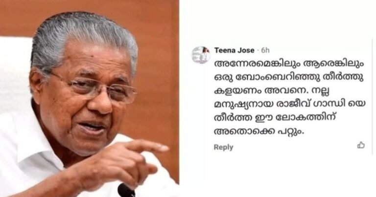 അന്നേരമെങ്കിലും ആരെങ്കിലും ഒരു ബോംബെറിഞ്ഞ് തീർത്തുകളയണം അവനെ…മുഖ്യമന്ത്രിയെ വധിക്കണമെന്ന് സിസ്റ്റർ ടീന ജോസ് തിരുവനന്തപുരം ∙ മുഖ്യമന്ത്രിയെ വധിക്കണമെന്ന് ആഹ്വാനം ചെയ്ത തരത്തിലുള്ള കമന്റ് ഫെയ്സ്ബുക്കിൽ രേഖപ്പെടുത്തിയതിനാൽ സിസ്റ്റർ ടീന ജോസ് വീണ്ടും വിവാദത്തിലേക്ക്. തദ്ദേശ തെരഞ്ഞെടുപ്പ് പ്രചാരണങ്ങൾക്ക് മുഖ്യമന്ത്രി പങ്കെടുക്കും എന്ന ഒരു പോസ്റ്റിനാണ് ടീന ജോസ് കടുവായ കമന്റ് പോസ്റ്റ് ചെയ്തത്. സെൽറ്റൻ എൽ ഡിസൂസ എന്നയാളുടെ ഫെയ്സ്ബുക്ക് പോസ്റ്റിലാണ് ടീന ജോസ് “ബോംബെറിഞ്ഞ് തീർത്തുകളയണം” എന്ന തരത്തിലുള്ള പരാമർശം രേഖപ്പെടുത്തിയത്. “അന്നേരമെങ്കിലും ആരെങ്കിലും … Continue reading അന്നേരമെങ്കിലും ആരെങ്കിലും ഒരു ബോംബെറിഞ്ഞ് തീർത്തുകളയണം അവനെ…മുഖ്യമന്ത്രിയെ വധിക്കണമെന്ന് സിസ്റ്റർ ടീന ജോസ്